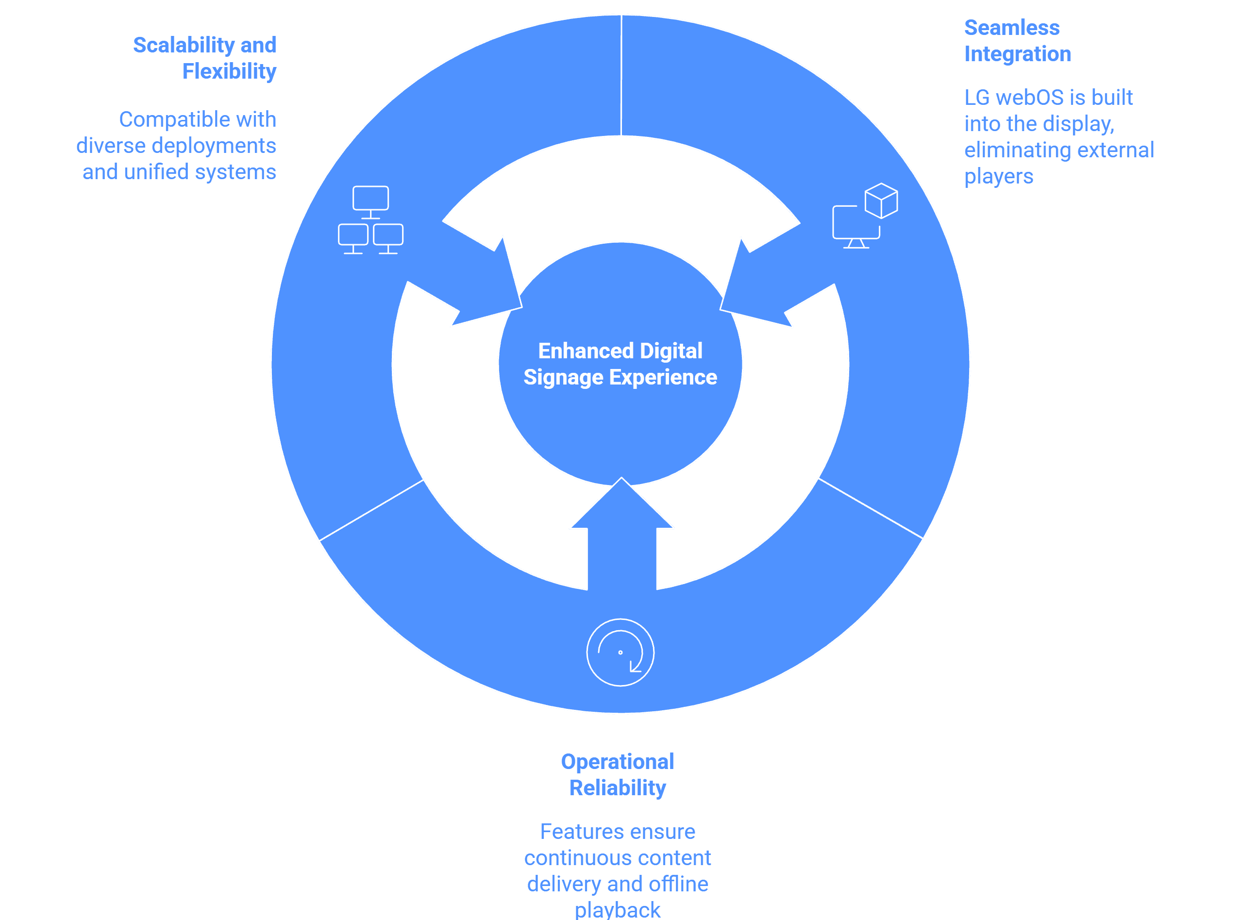 توافق برنامج اللافتات الرقمية مع شاشات LG webOS يوفر العديد من المزايا المميزة، والتي تنبع بشكل أساسي من طبيعته كجهاز نظام على شريحة (SoC) ودمجه في نظام إدارة محتوى موحد ومرن.