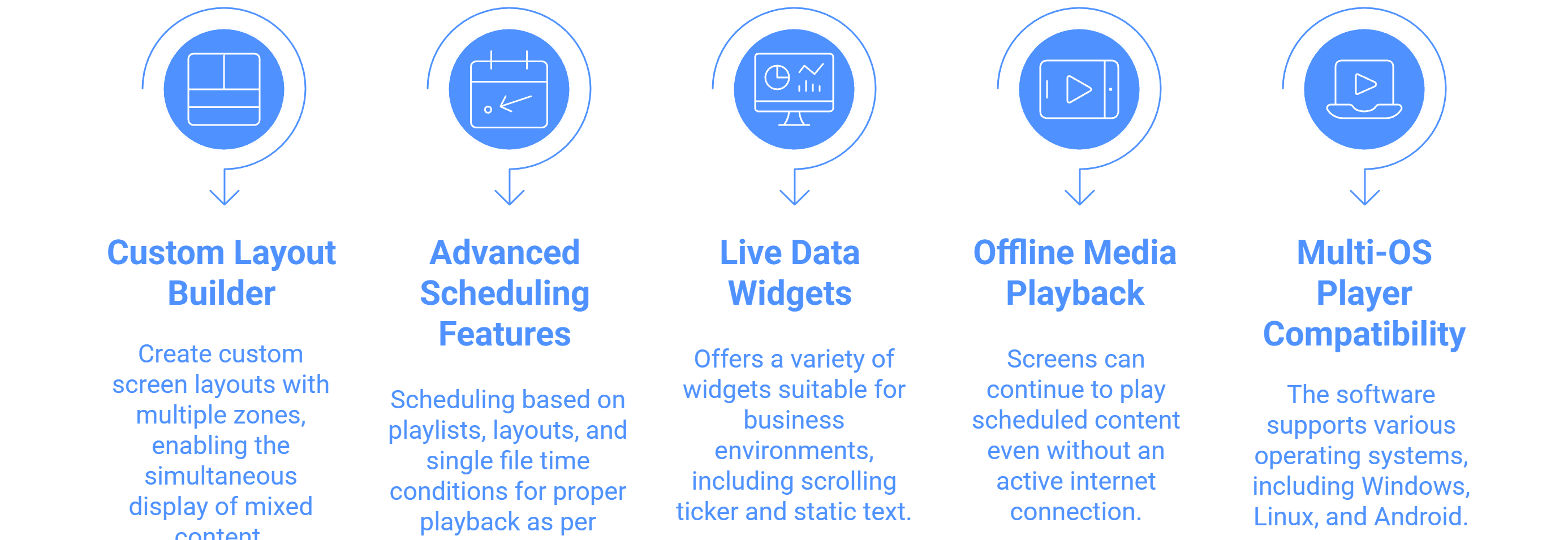جدولة ونشر المحتوى | جدولة متقدمة | تشمل الميزات الجدولة بناءً على قوائم التشغيل، والتخطيطات، وظروف الوقت لملف واحد. تدعم جدولة قائمة التنبيه وشرط وقت العرض القائم على الجدول الزمني المتكرر لأتمتة. |