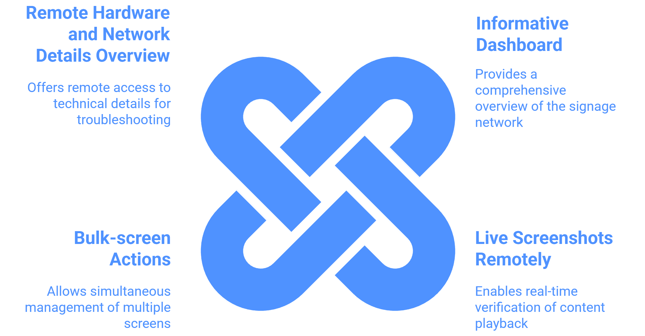 | القدرة على إرسال التكوينات، وإضافة قوائم التشغيل، وأخذ لقطات حية، وإعادة تشغيل التطبيقات على أكثر من 100 شاشة ببضع نقرات.