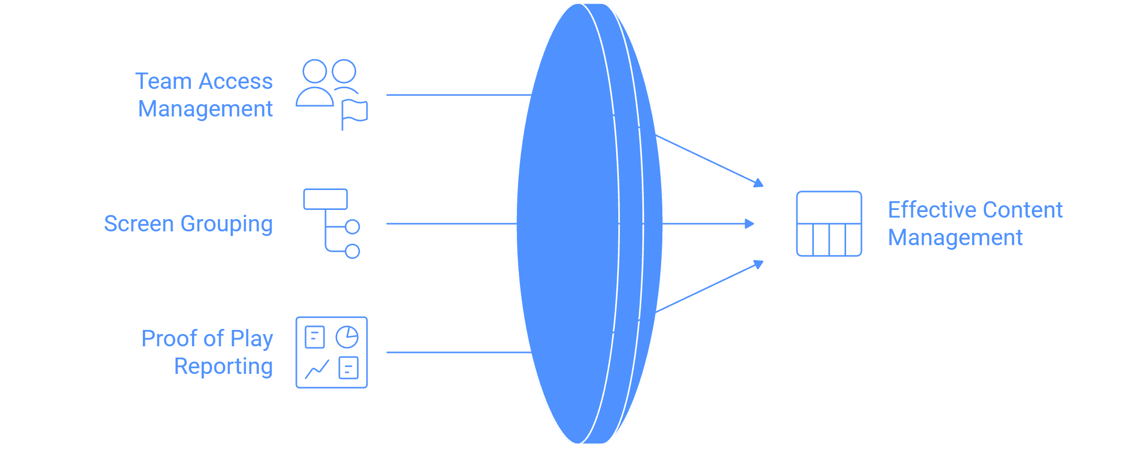 نشر المحتوى | يمكن نشر المحتوى عبر نشر ملفات الوسائط مباشرة أو المحتوى من قوائم التشغيل إلى أي عدد من الشاشات باستخدام ترشيح متقدم. يمكن تعيين المحتوى بطريقة استبدال أو إضافة. | |