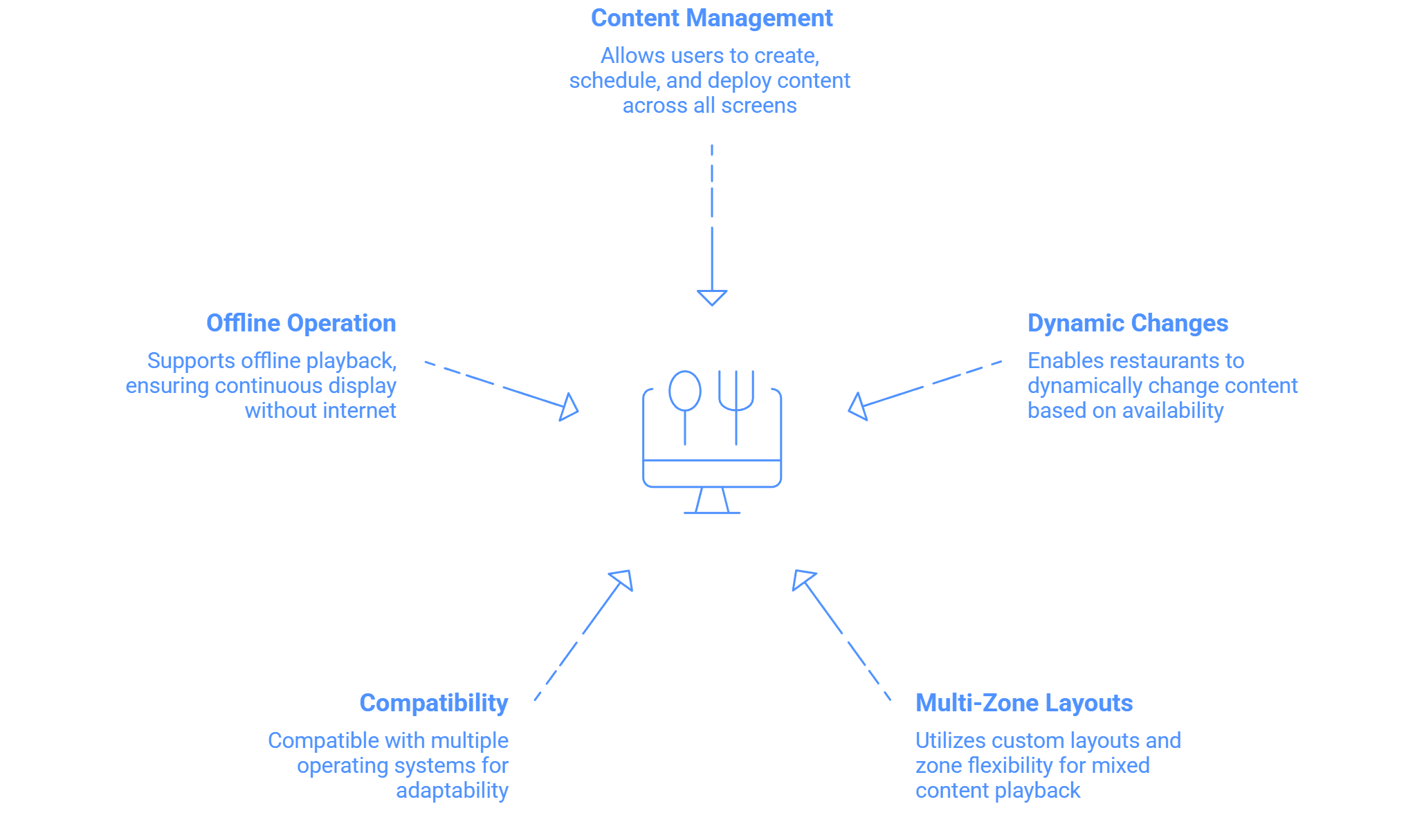 برنامج قائمة الطعام الرقمية هو تطبيق محدد ل برمجيات الإعلان الرقمي ونظام إدارة المحتوى (CMS)، مصمم بشكل خاص للاستخدام في المطاعم، والمقاهي، ونوادي الطعام، ومنافذ الخدمة السريعة. الغرض الأساسي منه هو استبدال القوائم الثابتة المطبوعة ب شاشات ديناميكية وجذابة تعمل على تحسين العمليات وتعزز تجربة العملاء.