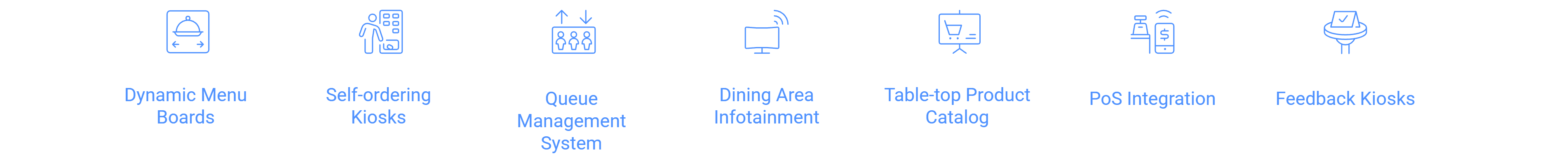 لوحات القوائم الديناميكية: تُستخدم هذه لعرض القوائم، والأطباق الشهية المعروضة، والترويج والعروض الخاصة بشكل ديناميكي. تضمن تحديث القائمة والأسعار في الوقت الحقيقي.