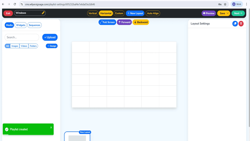 Once the playlist has been created, it is sent to the potent playlist editor of the Samsung Tizen signage management software. The interface consists of three tabs (Media, Widgets, Sequences), a media library panel on the left ( + Upload button and filtering: All, Images, Videos, Folders, & Design) and a big canvas where the content is organized in a grid.