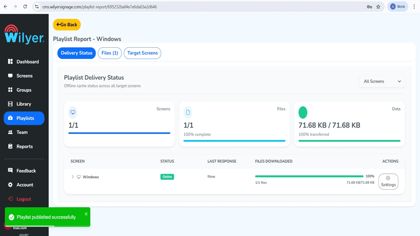 Once it has been published, the Playlist Report will display delivery status. The dashboard shows file transfer progress (71.68 KB / 71.68 KB) which proves that what you are sending is being transferred to the Windows PC.