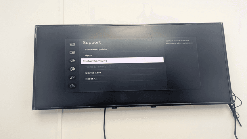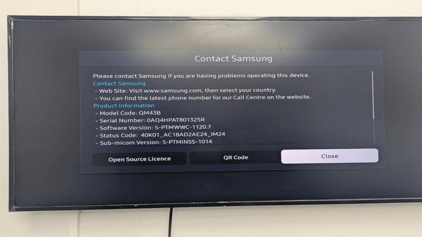 The Contact Samsung screen also gives direct contact details of technical support as well as product vital details required during troubleshooting and Samsung Tizen CMS configuration.