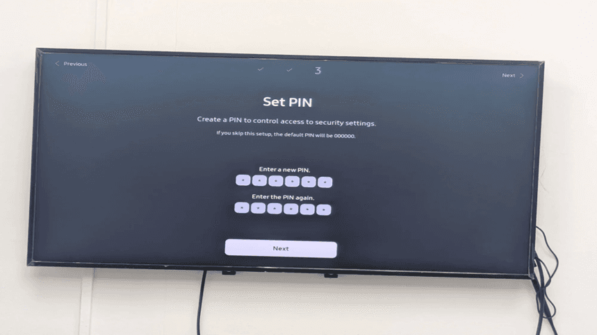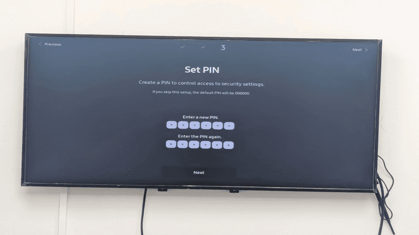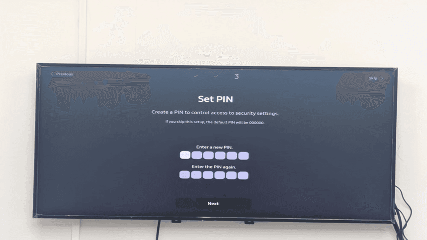 The next button can now be seen clearly on the Set PIN screen. Both PIN entry fields appear empty and willing to take input. The last security measure involved in Samsung Tizen signage installation is the creation of a custom PIN.