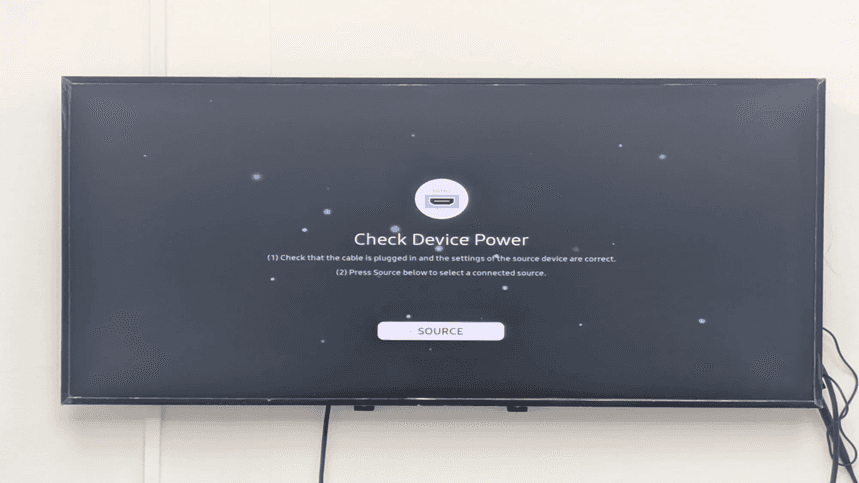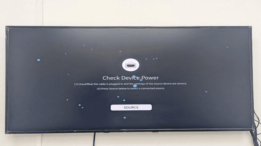 After starting your Samsung Tizen display your first screen is the one which shows the Check Device Power. It means that the display is in search of an HDMI input source. The screen displays the input (HDMI 2 in this case) that is being used at the moment and asks you to make sure that cable connections are correct or press the Source button and choose another input.
