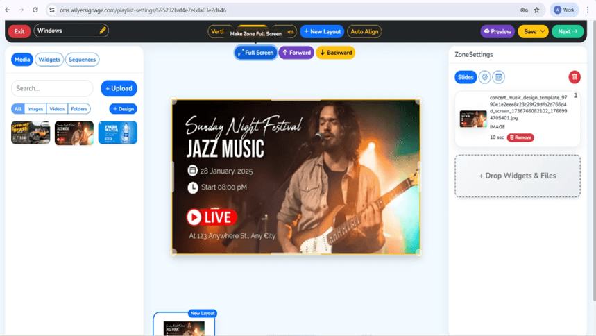 The preview window provides you with a precise view of what you can see on your digital signage display, which helps to check the proper configuration.