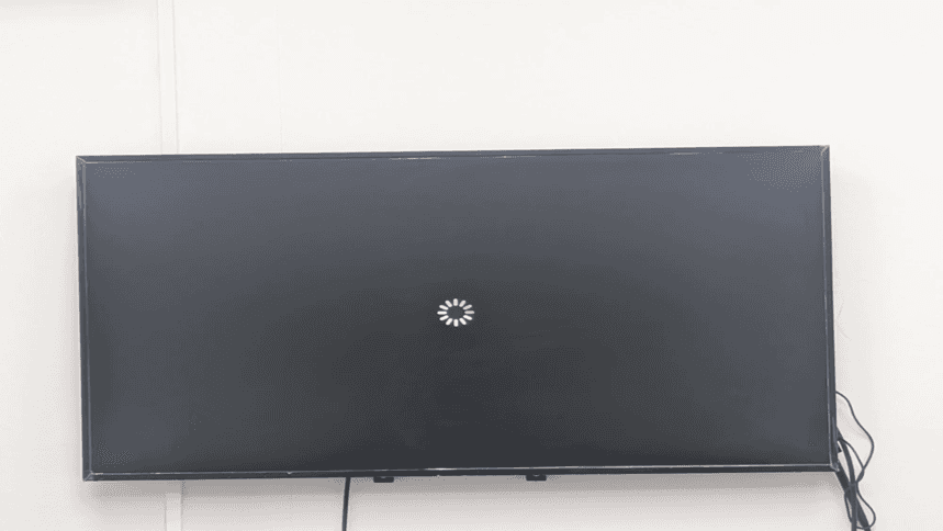 A loading screen with a circular spinning indicator appears as the Samsung Tizen display initializes the configured settings and prepares to launch the custom signage application. This process typically takes 30-60 seconds.