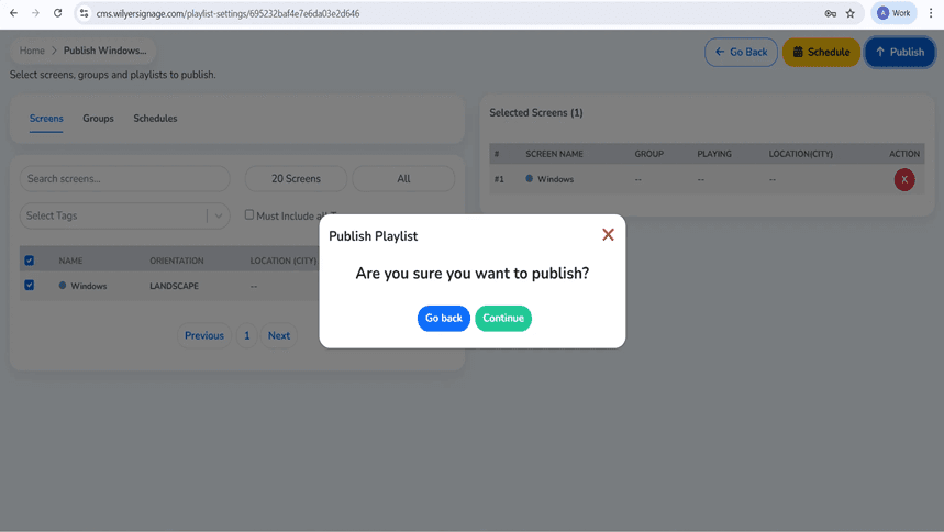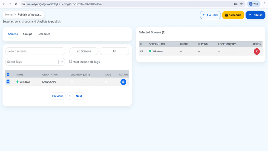 Click the Next- button to go to the publish screen. The "Publish Windows Publishing" is available through an interface where you can select screens and groups as well as playlists. It has three tabs, which are Screens, Groups and Schedules. The list on the screen displays 20 screens, and has filter All on and a search option.