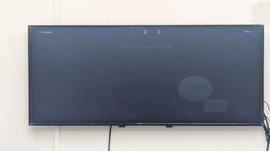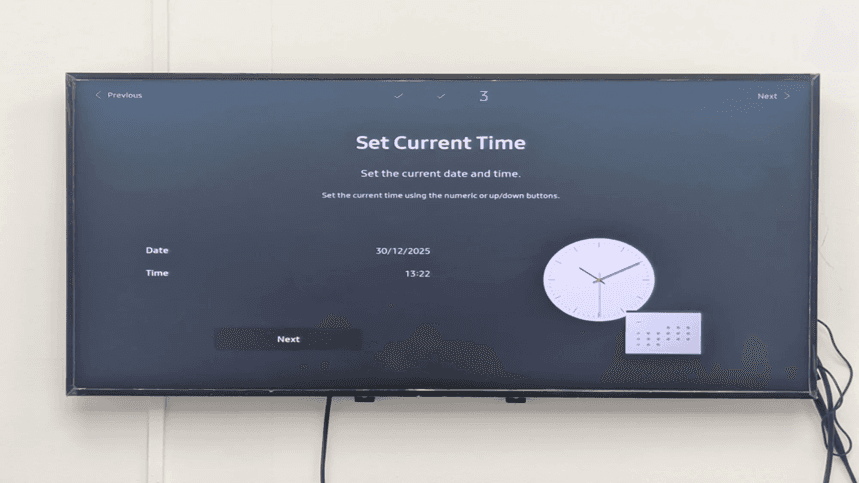 The loading of the screen of setting the current time (step 2 out of 3). An icon clock and calendar shows that the system requires a date and time setup that is vital in timely content delivery in Samsung Tizen digital signage applications.