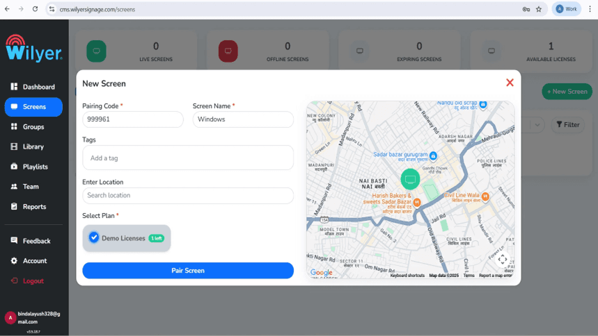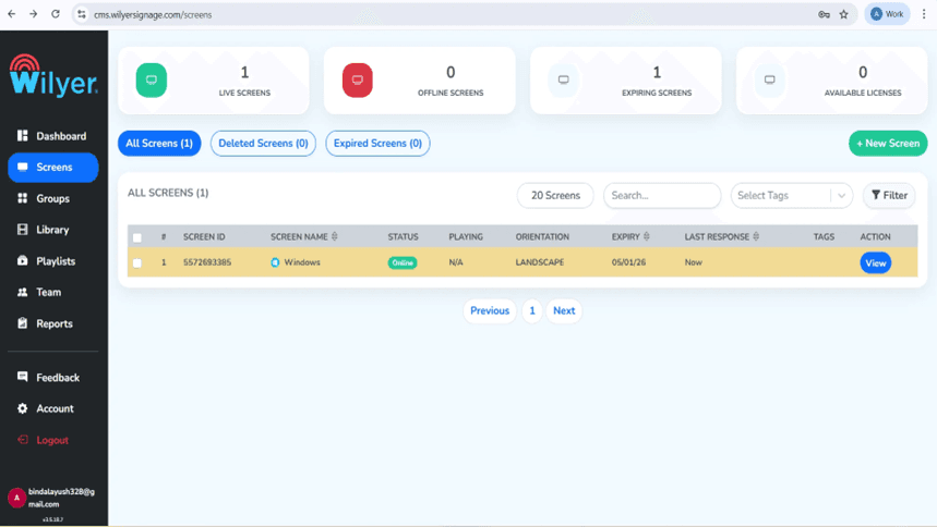 To register your Samsung Tizen signage player, in your Samsung Tizen CMS web dashboard (i.e. cms.wilyersignage.com/screens), click the + New Screen button to start registering. You can see at the dashboard that you are in 0 Live Screens, 0 Offline Screens, 0 Expiring Screens, and 1 Available License, meaning that you have the capacity to add this display.