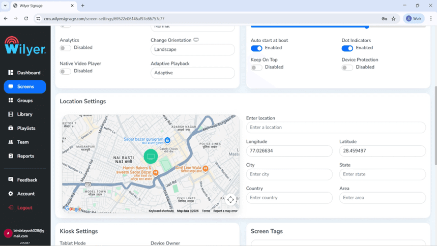 You can also scroll down to Location Settings, with an interactive map (Google Maps integration) of your location of the Samsung smart signage with a pin marker. You may set: Enter location (address search), Longitude (77.026634), Latitude (28.459497), City, State, Country, and Area (fields); to view exact Samsung Tizen signage solution geolocation.