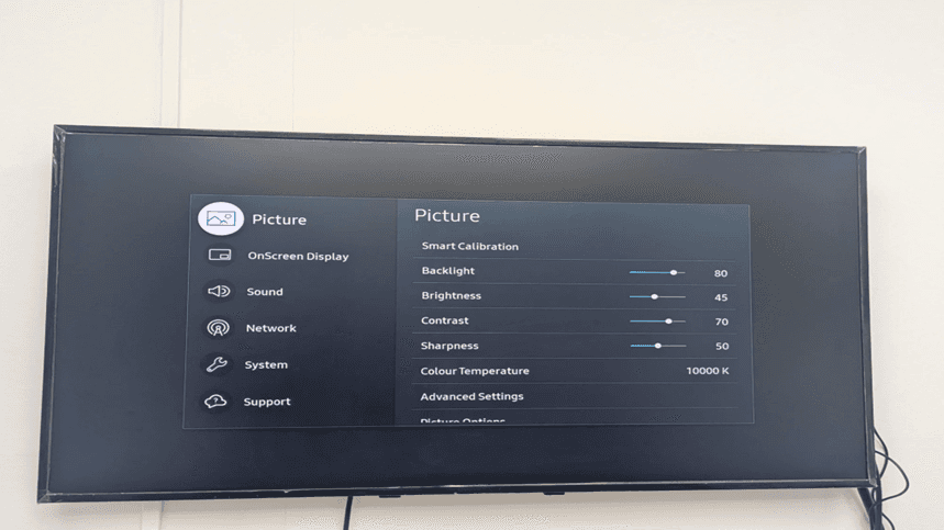 To access the main Settings menu, use the Menu button of the Samsung display remote Tizen. The Picture settings screen will be the first one that will have Smart Calibration, Backlight, Brightness, Contrast, Sharpness, Colour Temperature and Advanced Settings.