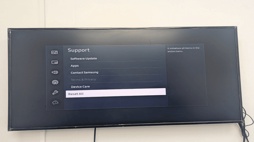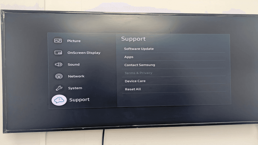 The Support menu gives access to the necessary Samsung Tizen signage management features such as Software Update, Apps, Contact Samsung, Terms and Privacy, and Device Care, and Reset All.