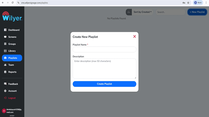 Go to the left sidebar menu to the Playlists. Having No Playlists Found on the screen, press the + New Playlist button at the upper-right hand side to create the first content playlist of Samsung Tizen display content management.