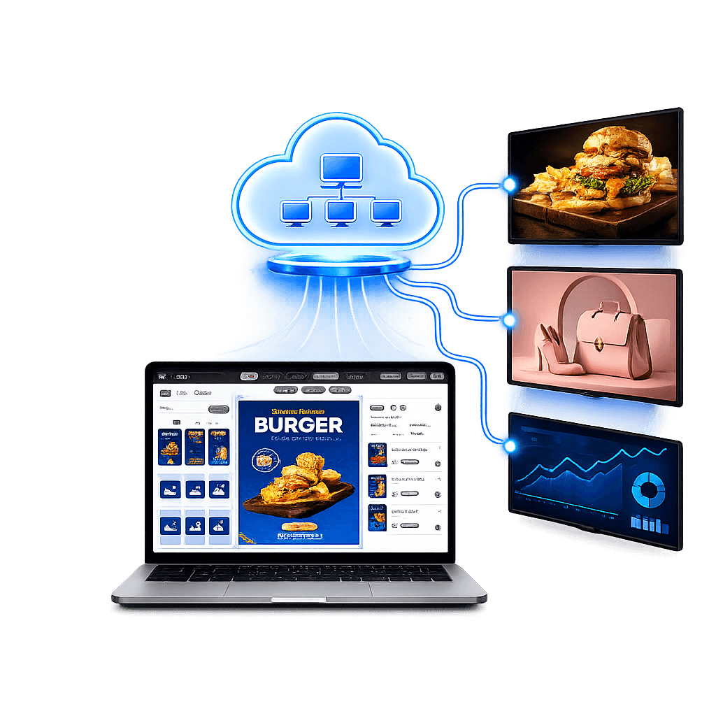 Digital signage software is a cloud-based system used to create, manage, schedule, and display content across digital screens from a centralized dashboard. It enables businesses to control visual communication efficiently across single or multiple screens in real time.