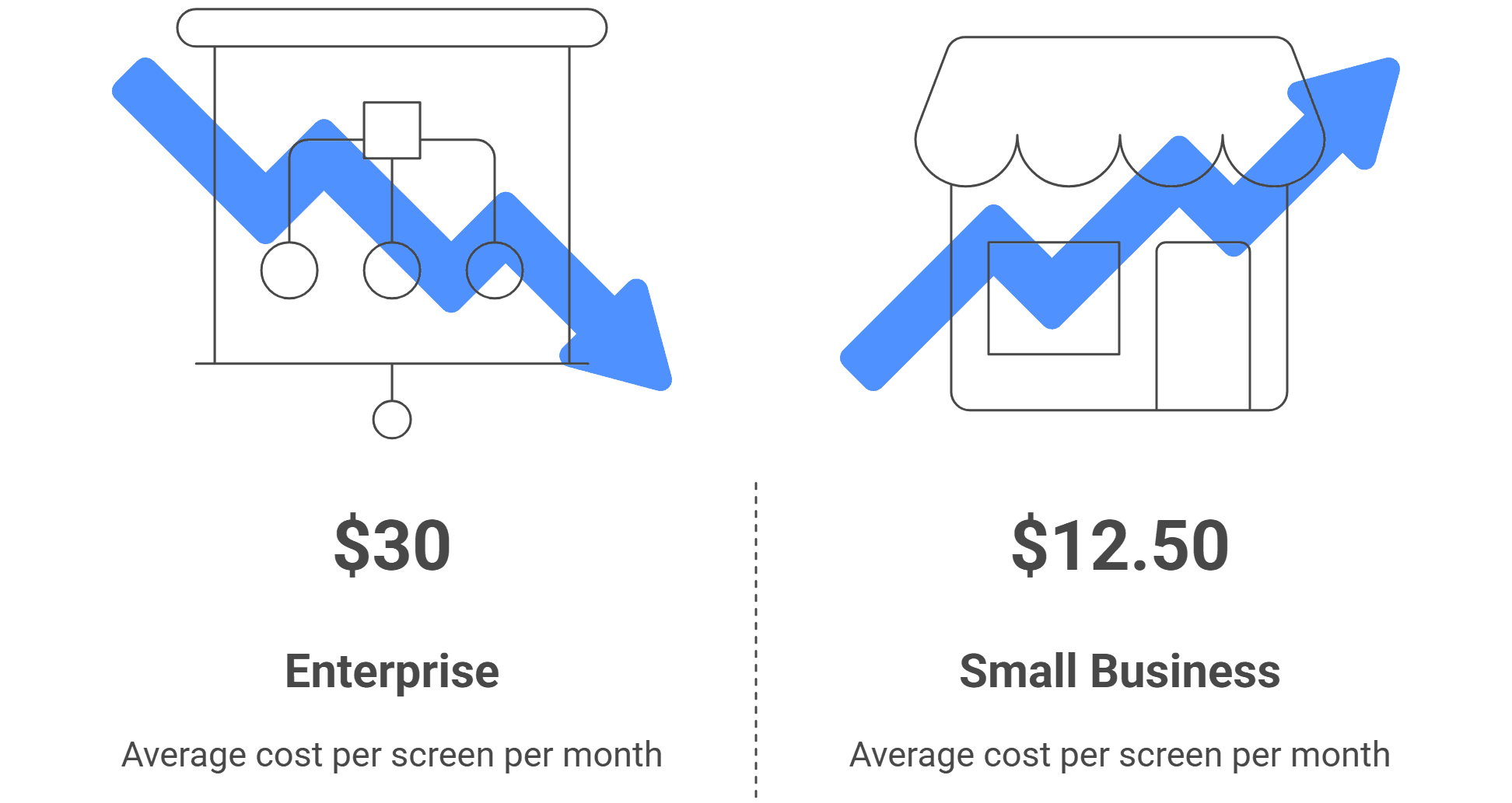 El precio para pequeñas empresas es típicamente de $10 a $15 por pantalla, por mes, lo que lo hace asequible y disponible incluso para negocios de una sola ubicación. También es todo incluido para todo lo que necesitas para gestionar la pantalla, incluidas las actualizaciones de contenido, la supervisión del sistema y te proporciona todo para gestionar una pantalla fácilmente.
