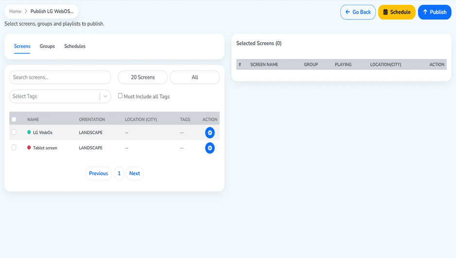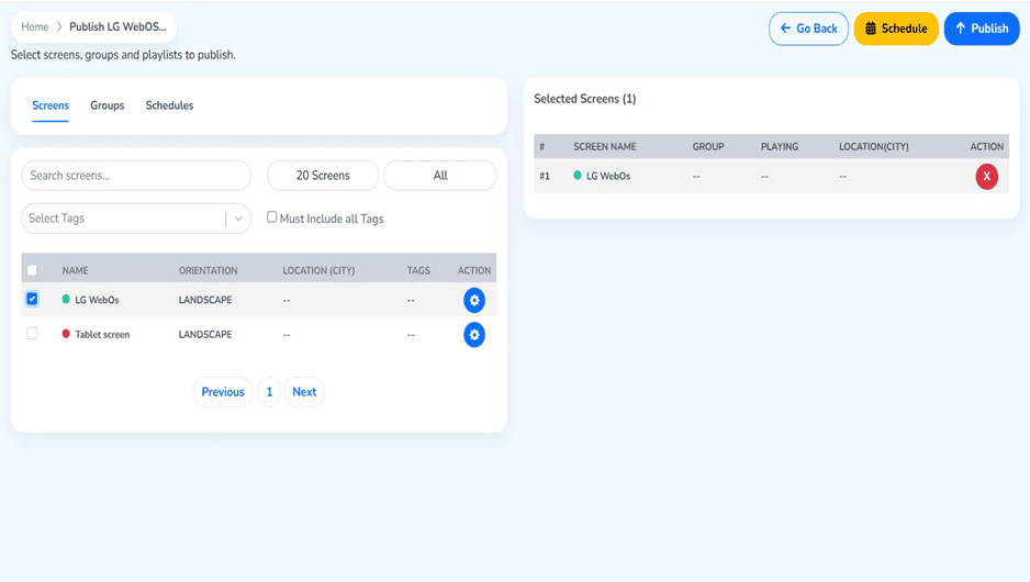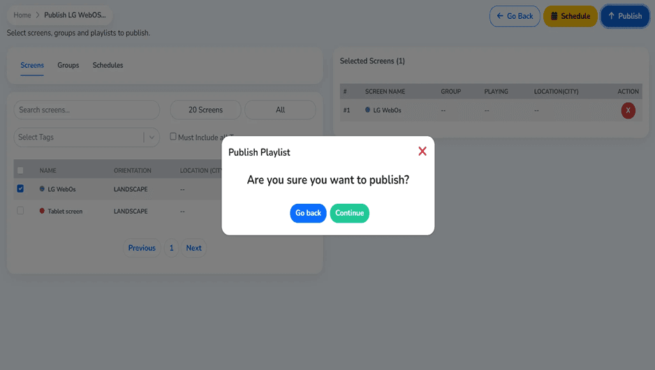 And the target screen is chosen, you are now ready to publish. It is important to note that you might choose both screens in the event you wanted to show the same content on a display or more advanced publishing using the Groups and Schedules tabs.