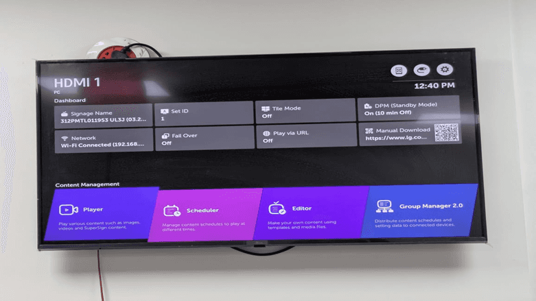 The following screen shows LG webOS Signage Dashboard, the location where important device and content settings are handled. It displays the present input source (HDMI 1), network connection state, signage name and system settings including Tile Mode, Fail Over and Standby Mode. The bottom part has access to Content Management tools, such as Player, Scheduler, Editor, and Group Manager that allow one to play content, arrange playlists, design, and administer multiple screens. This dashboard serves as a control board of using and managing LG webOS digital signage displays.