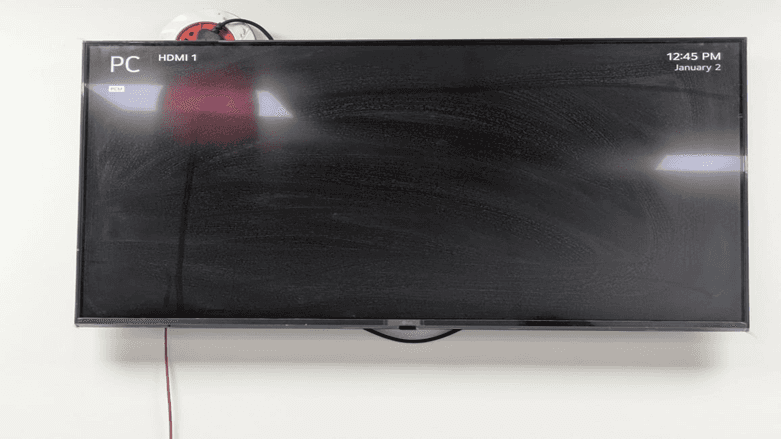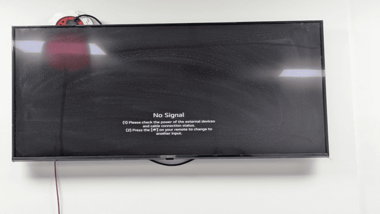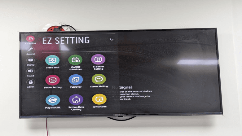 No Signal is displayed when nothing external is connected to HDMI. This is common in the process of establishing the display to be used with digital signage. The screen gives you the message to verify power and cable connection in external devices or press the input button on the remote to switch sources. We are going to set it up to have built-in digital signage; hence will go to access the settings menu.