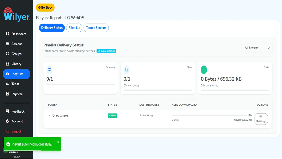 Monitor the playlist deployment through the Playlist Report. A Successful status confirms that all content has been delivered correctly and the LG webOS screen is online and ready for playback.