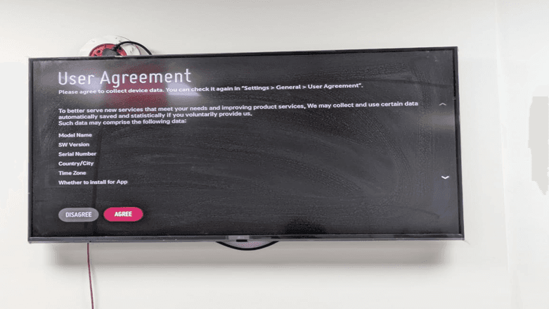The policy of LG data collection is shown on the User Agreement screen. It is a default of the LG WebOS signage app installation. See the terms and proceed by clicking on AGREE. The agreement specifies the type of device data (model name, SW version, serial number, country/city, time zone, and app installation preferences) that could be obtained to enhance services.