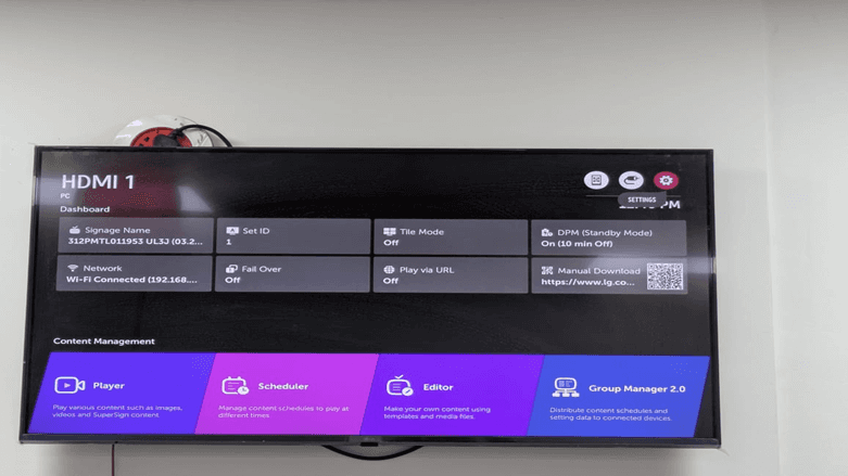 Based on the main dashboard, all the main details about your display such as the name of the signage, Set ID, network status, and the content management options are available. Three icons in the upper right corner are used to access other settings. When you have the settings icon (gear icon), then you will have a menu of advanced configuration.