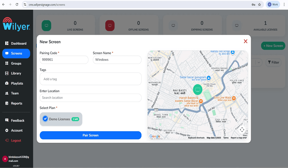 On the CMS dashboard, under the Screens section, press New Screen to register your windows digital signage display.