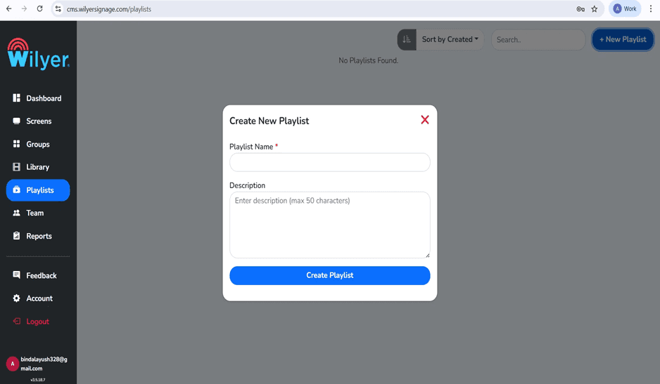 Go to the playlists section of the Wilyer CMS, and click on the + New Playlist before beginning to create your digital menu board or promotional content.