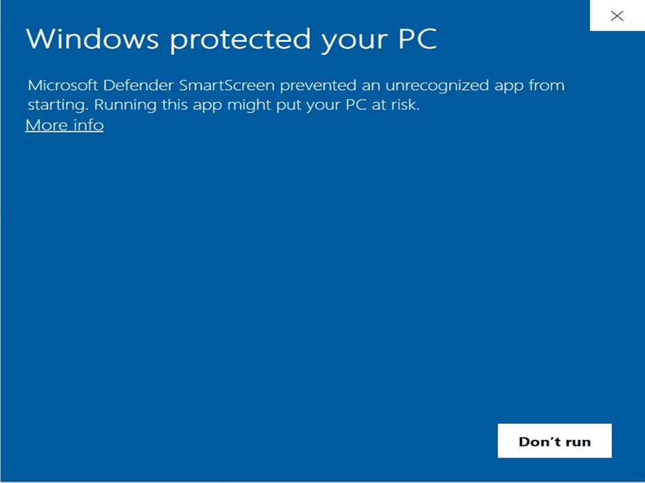 Windows Defender SmartScreen may display an additional security warning stating that an unrecognized application has been blocked from running, as it could potentially put your computer at risk. On this screen, a link labeled “More info” will appear at the bottom, which can be selected to proceed with the installation.