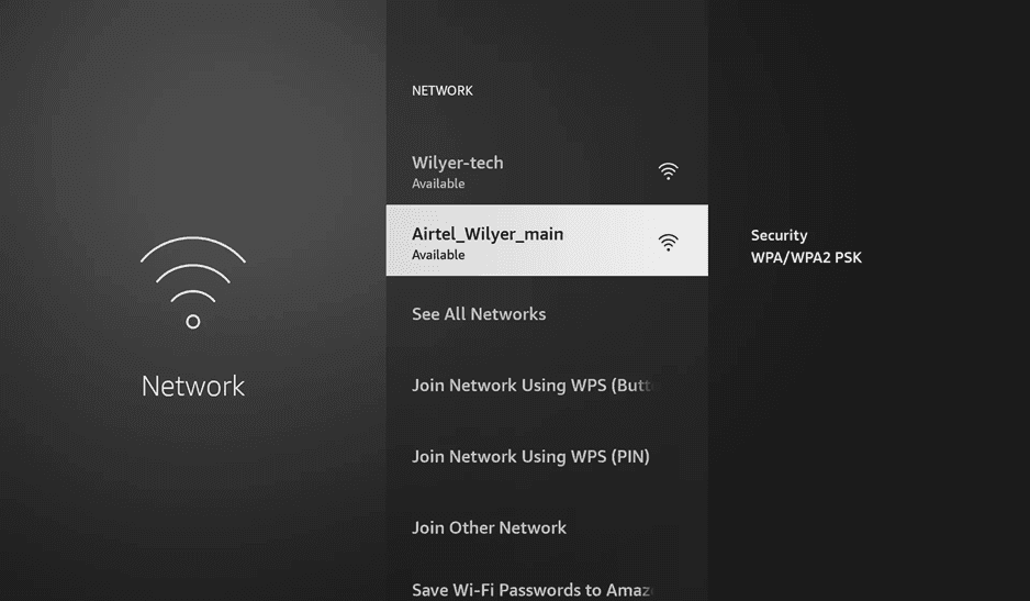 The settings menu contains the option of Network where you can set up your internet connection. Cloud digital signage on Firestick functionality requires a stable network connection. The Firestick digital display system must have a good internet connection to update its content remotely. Your Firestick digital signage software network settings screen presents a list of the available WiFi networks and connection options.