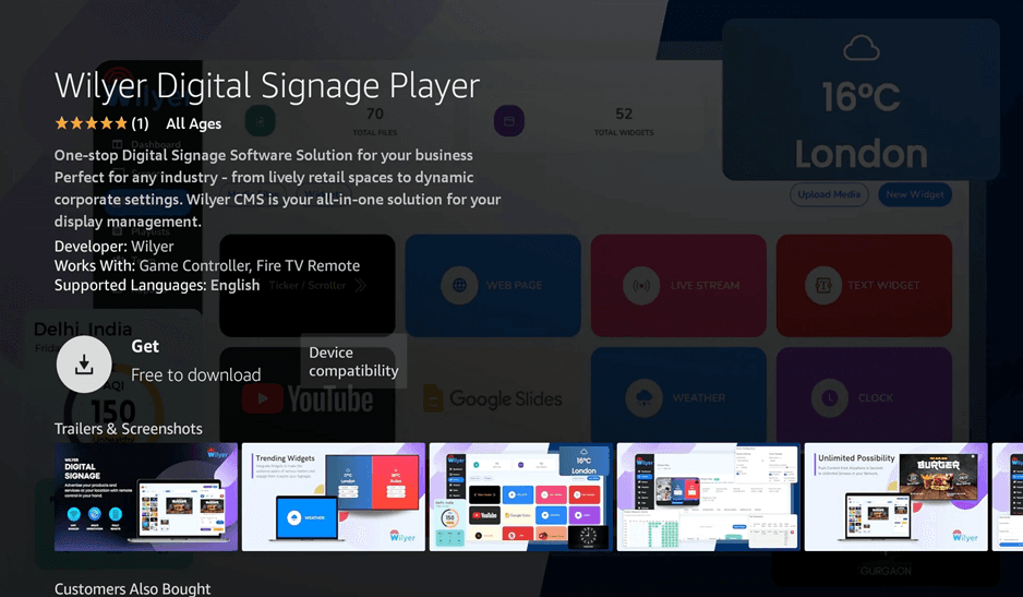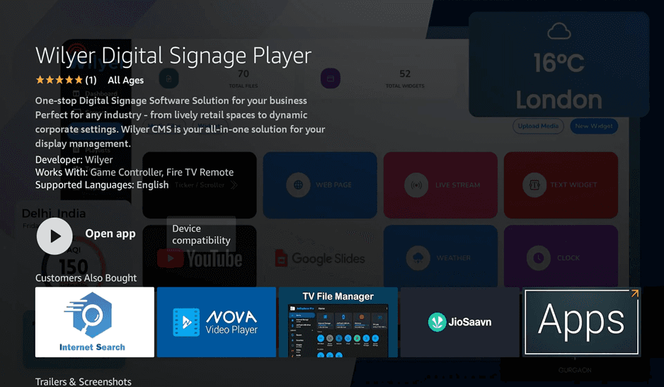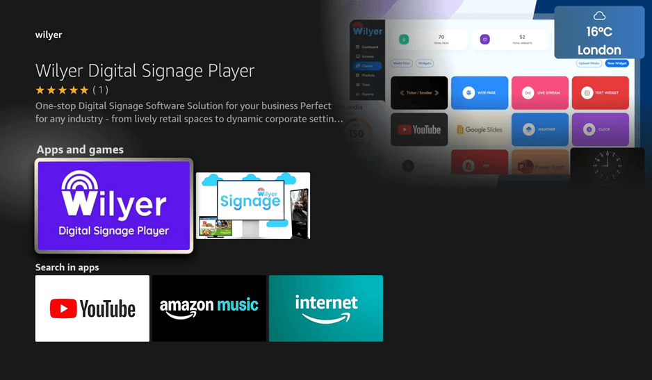 Based on the search results, you can choose Wilyer Digital Signage Player to see the details of the app. This cloud digital signage on Firestick solution is your digital signage software on Firestick TV one-stop solution that is suitable in any industry including retail and corporate environment. The app description emphasizes the fact that it is a digital signage player on Firestick TV that supports rotating screen Firestick signage and Firestick kiosk mode signage setups.