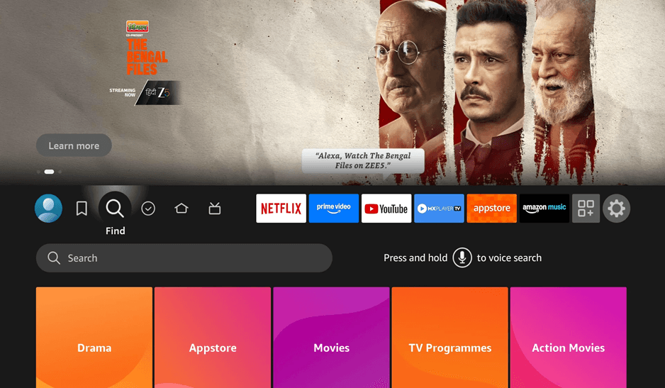 Plug the Fire T. V. Stick on your display and switch it on. You will have seen the home screen of Firestick TV that has different streaming applications and content. This is where you begin to change your device into a Firestick digital signage player. We have Netflix, Prime Video, YouTube, and other entertainment apps displayed on the home, which we will be converting to a commercial Netflix Firestick TV display.